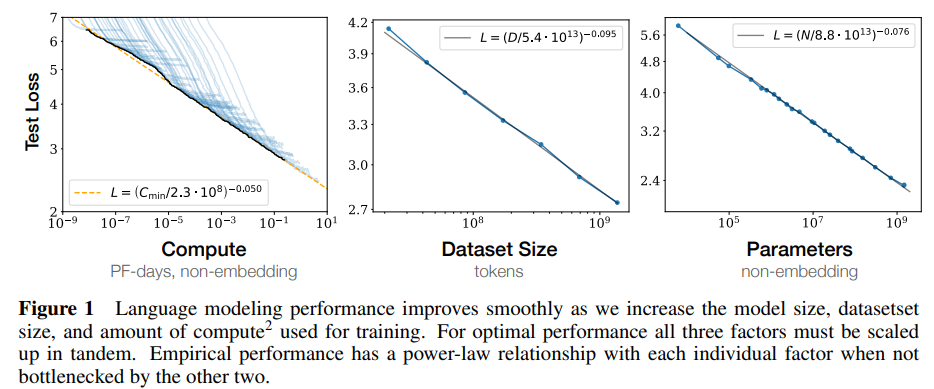 모델의 크기, 데이터셋 크기, 학습에서 사용되는 계산량을 간단한 Power law와 log scale로 표기 할 수 있다.